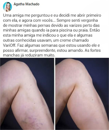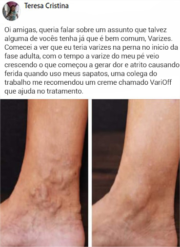 "Comecei a perceber os resultados logo no primeiro uso. Ele me deu uma sensação de alívio imediato nas pernas, deixou muito mais leve, eliminou a dor e relaxou também meus pés. Eu tive que usá-lo de manhã e à noite. Tirei fotos minhas antes e depois de usar o creme, para avaliar sua eficiência:".